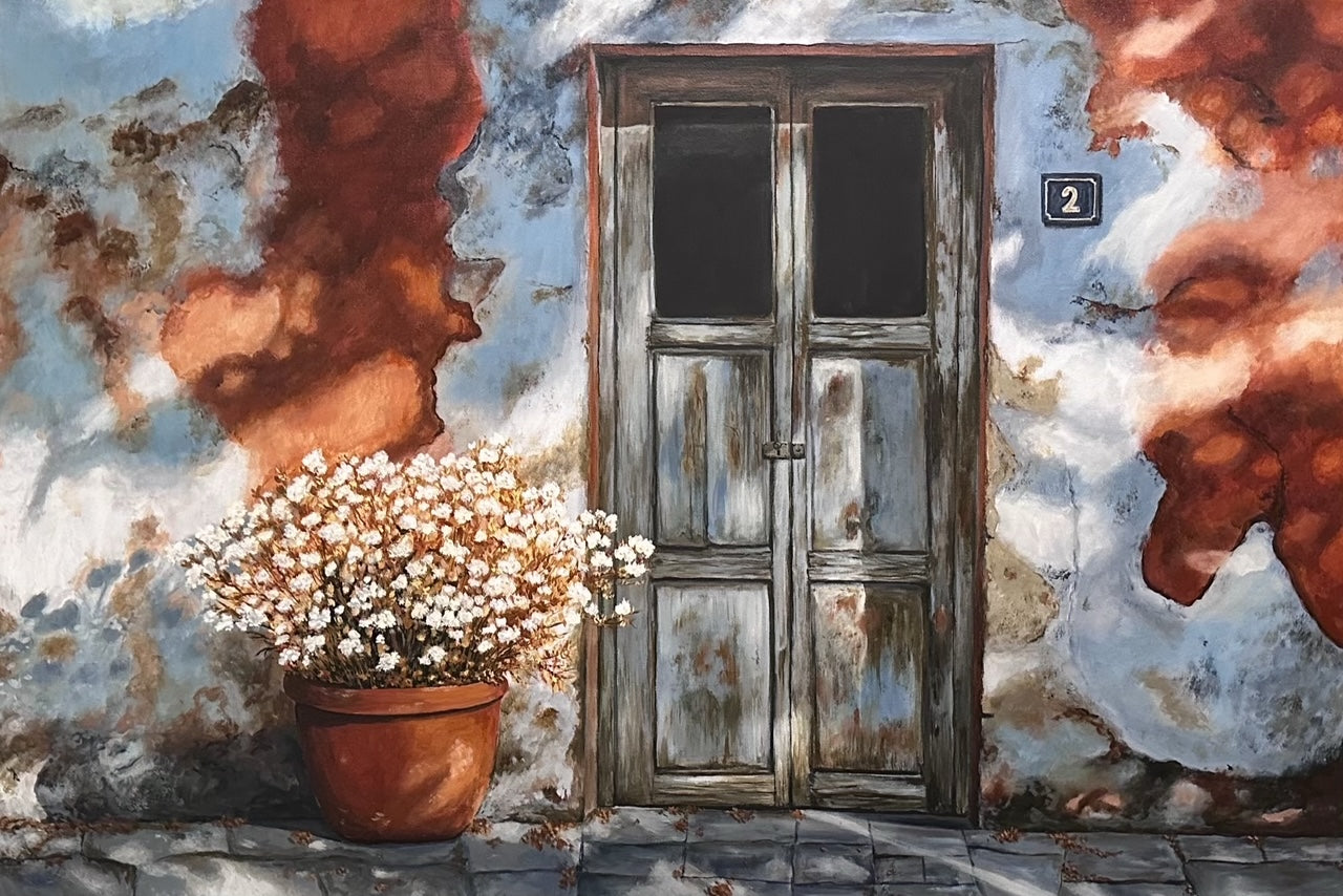 A pair of faded wooden doors sits beneath the number 2, framed by a textured wall washed in warm ochres and cool blues. A terracotta pot bursts with delicate white blooms, their softness a contrast to the flaking surface behind them. This painting celebrates timeworn beauty—the interplay between age and light, structure and softness. It’s a quiet moment, full of texture, memory, and the resilience of simple things.